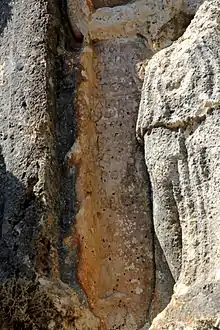 Between the lance on the left and the female figure an inscription of 13 lines is engraved in a narrow field. In it the goddess is referred to as ΑΘΗΝΑ ΚΡΙΣΟΑ (Athena Krisoa);. The epithet ΚΡΙΣΟΑ, derived from a place name, indicates a local variant of the divinity, but the place connected with the epithet cannot yet be located. It would certainly have been found in the north of Rough Cilica, however. The same epithet shows up in another inscription in the area and in both inscriptions Athena is also referred to as ΟΡΕΙΑ (Oreia, meaning "mountaindweller")[1]