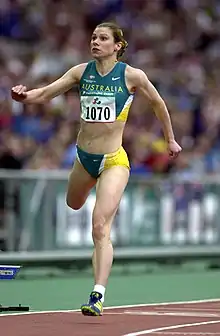 Action shot of Australian track athlete Lisa Llorens during her silver medal winning run in the 100 m T20 at the 2000 Summer Paralympics