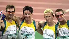 Australian track athletes (L-R) Neil Fuller, Stephen Wilson, Tim Matthews and Heath Francis after their gold medal win in the 4 x 400 m T46 relay, 2000 Summer Paralympics