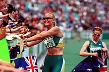Australian track athletes Katrina Webb (left) and Alison Quinn (right) celebrate with their Australian fans in the crowd over their medal wins in the 100 m T38 at the 2000 Sydney Paralympic Games, Day 07. Quinn won gold and Webb won silver in this event.