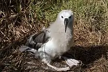 The Atlantic yellow-nosed albatross averages 81 cm (32 in) in length. It is a typical black and white mollymawk with a grey head and large eye patch, and its nape and hindneck are white. Its bill is black with a yellow culminicorn and a pink tip. It has a blackish grey saddle, tail and upperwing, and its underparts are predominantly white. Its underwing and primaries show a narrow black margin. The juvenile is similar to the adult but with a white head and black bill.[9] It can be differentiated from the Indian yellow-nosed by its darker head. Relative to other mollymawks it can be distinguished by its smaller size (the wings being particularly narrow) and the thin black edging to the underwing, The grey-headed albatross has a similar grey head but more extensive and less well defined black markings around the edge of the underwing. Salvin's albatross also has a grey head but has much broader wings, a pale bill and even narrower black borders to the underwing.