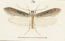 ♂. 23 mm. Head whitish-ochreous. Palpi with second joint fuscous, not reaching base of antennae, scales roughly projecting beneath towards apex, terminal joint sprinkled with fuscous. Antennal joints thrice as long as their apical width, ciliations 5. Thorax fuscous. Abdomen whitish-ochreous. Forewings elongate, narrow towards base, hardly dilated, costa gently arched, apex tolerably pointed, termen nearly straight, very oblique ; fuscous, mixed with grey in disc ; dorsum suffused with pale ochreous towards base, edged by a blackish raised dot at 1⁄5 of wing ; stigmata undefined, pale ochreous, plical nearly beneath first discal : cilia fuscous sprinkled with whitish-ochreous, base spinkled with blackish. Hindwings pale whitish-ochreous, suffused with pale grey except towards apex and posterior part of costa ; cilia ochreous-whitish. ♀. 9-10 mm. Forewings ovate-lanceolate ; fuscous suffusedly mixed with darker, especially towards base ; dorsal area suffused with whitish-ochreous towards base ; second discal stigma represented by a raised ochreous tuft edged with dark fuscous. Hindwings rudimentary.[2]