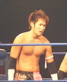 In March 2009, Kotoge entered the Indie Junior Challenger Determination tournament, defeating tag team partner Daisuke Harada in his first round match.[15] The finals of the tournament on April 4 was a three-way match between stablemates Kotoge, Harada and Tadasuke, with Harada once again being victorious.[15] On June 6, 2009, Tadasuke, considered the lowest ranking member of Blood & Guts, turned on the stable and joined rival group LOV (Legion of Violence).[16] The turn built to a Hair vs. Hair match on July 25, where Kotoge was defeated by Tadasuke.[17] With Zeus out of Osaka Pro, Kotoge and Harada disbanded the Blood & Guts stable, renamed their tag team Momo no Seishun Tag and concentrated on chasing the Osaka Pro Wrestling Tag Team Championship. On January 16, 2010, Kotoge and Harada defeated Orochi and Tadasuke to become the number one contenders to the Osaka Pro Wrestling Tag Team Championship and finally, on February 11, defeated Hideyoshi and Masamune to win the Tag Team Championship for the first time.[9][12][18][19] On May 9, Kotoge and Harada teamed with Takoyakida to defeat Tokyo Gurentai (Fujita, Mazada and Nosawa Rongai) for the UWA World Trios Championship.[12][18][20] They would hold the Trios Championship for a month, before losing it to Ebessan, Kanjyouro Matsuyama and Kuishinbo Kamen.[18][20][21] On July 17, Momo no Seishun Tag lost the Osaka Pro Wrestling Tag Team Championship to Don Fujii and Masaaki Mochizuki, representing rival promotion Dragon Gate.[18][19]