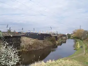 ![]() Attercliffe Station remains in 2009, seen from the Sheffield Canal, with the floodlights of the former Don Valley Stadium in the background. | |