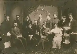 During World War I, most Lithuanian schools evacuated to Voronezh where students reestablished Aušrininkai groups. By end of 1915, they numbered seven groups with 130 students.[7] There was also a unified Voronezh board, chaired by Juozas Lukoševičius. In 1917, Aušrininkai had a choir, string orchestra, and theater group.[8] A small group, which included Julius Janonis and Stasys Brašiškis and became known as visuomenininkai, advocated a more violent revolution and splintered off from the main group in December 1915.[9] Other, smaller groups organized in Moscow, Saint Petersburg, Bogoroditsk (Dotnuva Agricultural School), Borovichi (Panevėžys School), Taganrog (Jelgava Gymnasium), Sorochinsk (Veiveriai Teachers' Seminary), Yaroslavl (Marijampolė Gymnasium), and elsewhere.[8][10] In May 1917, Aušrininkai organized a conference which debated the ideology and decided to revive Aušrinė.[10] Students began returning to Lithuania after the Act of Independence of Lithuania in February 1918 and a mass repatriation was organized in June 1918.[11]