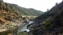 Upstream of the dam site, Auburn-Foresthill Road – one of the only all-weather thoroughfares of the region – would be inundated by the proposed reservoir. In preparation for the reservoir's filling, it was rerouted over a three-span, 2,428-foot (740 m)-long truss bridge rising 730 feet (220 m) above the river.[13] Even though Auburn Dam would never be completed, the bridge was still required because the pool behind the cofferdam would flood the original river crossing.[14] It also improved safety and reduced travel time by eliminating a steep, narrow and winding grade into the canyon on either side of the river, as comparisons to maps showing the old road alignment will attest. The contracts for various projects pertaining to the relocation of the roadway were given to O.K. Mittry and Sons, Hensel Phelps Construction Company, and Willamette-Western Corporation, the latter for the construction of the actual bridge. The Foresthill Bridge, the fourth highest bridge in the United States, was completed in 1973.[3]