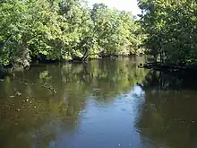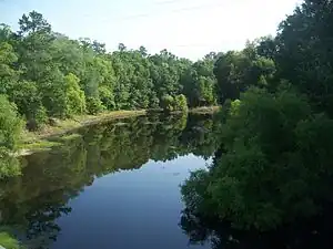 Although the Wacissa River is the largest tributary of the Aucilla River, it breaks into a number of braided channels before reaching the Aucilla. In the first half of the 19th century, cotton growers of Jefferson and Madison Counties wanted to carry their cotton to seaports on the coast, but the intermittent underground segments of the Aucilla River and the narrow and shallow braided channels of the lower Wacissa did not permit the passage of barges. The Wacissa and Aucilla Navigation Company was chartered in 1831 to dig a canal from the navigable portion of the Wacissa to below Nuttall Rise, where the Aucilla returns above ground for the last time before reaching the Gulf of Mexico. Construction of the canal did not start until 1851. Slaves from local plantations were hired from their owners to dig the canal, which was cut through limestone. Work on the canal was halted in 1856, while parts of the canal were still too shallow for loaded barges. By that time, railroads had reached the plantation country, removing the urgency of the need for the canal. In the 21st century, a proposal to rename the Slave Canal proved to be unpopular and failed.[7][8] Today, the Slave Canal is a popular paddling trail maintained by the state of Florida.[9]