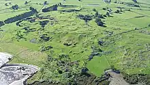 The field has produced voluminous lava flows that cover much of the Auckland isthmus. One of the longest runs from Mt Saint John northward, almost crossing the Waitematā Harbour to form Meola Reef.[10] More than 50 lava tubes and other lava caves have been discovered, including the 290-metre (950 ft)-long Wiri Lava Cave.[11] The second-longest individual cave in the Auckland field, some 270 metres (890 ft) in total length, is the Cave of a Thousand Press-ups to the east of Maungakiekie/One Tree Hill.[12] Two impressive depressions caused by lava cave collapses are the Puka Street Grotto and the nearby Hochstetter Pond, also known as Grotto Street Pond, in Onehunga.[13][14]
