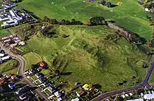 | Te Puke ō Tara / Otara Hill | 56.5 | 89 metres (292 ft) (quarried) | 36°56′50″S 174°53′54″E / 36.947105°S 174.898363°E | ![]() The buildings in the middle of the photo are on the site of quarried away Te Puke ō Tara / Otara Hill volcano, 2009 | |