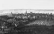 The Thirty Years' War put an end to all the positive developments mentioned above. On 20 November 1644, Bensheim was occupied by French and Swedish troops, who were driven out again on 2 December by Bavarian units. Later, the legend of the Fraa vun Bensem arose (the “woman from Bensheim” is said to have led the Bavarians into town through a secret route). In 1650, after just under 200 years of being pledged to the Electorate of the Palatinate, Bensheim was once again redeemed by the Archbishopric of Mainz.