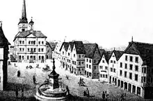 Bensheim's marketplace in 1869 (lithograph by F. Rau)