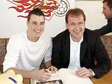 Mayor Thorsten Herrmann (right) with Dominik Klein, entering himself in Bensheim's Golden Book, on 10 March 2007