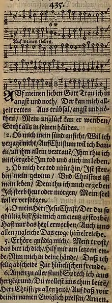 In 1607, "Auf meinen lieben Gott" was printed in 766 Geistliche Psalmen in Nürnberg.[1] The publication does not name a text author for the hymn.[1] In a 1611 hymnal, the hymn "Auf Jesum Christ steht all mein Thun" appears as a text written by Sigismund Weingärtner, an author about whom little is known. For the next hymn, "Auf meinen lieben Gott", no author name is given: it has been assumed that Weingärtner wrote this text too.[1][2] The beginning is "Auf meinen lieben Gott trau ich in Angst und Not", expressing trust in God even in anxiety and distress.[3][4][5]