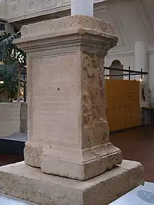 The Augsburg Victory Altar (German: Augsburger Siegesaltar) is the name given to a Roman altar of the victory goddess Victoria, which was set up on the occasion of the victory of a Roman army over the tribe of the Juthungi near the Rhaetian provincial capital Augusta Vindelicorum. The mention of the rebel emperor Postumus dates the creation of the altar to 11 September 260.[1] The stone is kept in the Römisches Museum Augsburg.