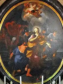 Miracles associated with Aurea while she was in Ostia relate how a Christian prisoner named Censorinus had his chains miraculously loosened after he had been comforted by Aurea.[5] Seventeen soldiers[lower-alpha 1] converted to Christianity as a result of this miracle, and were later beheaded near Ostia's Arch of Caracalla. Another legend states that Aurea and her friends also brought back to life the dead son of a shoemaker.[5] Ulpius Romulus executed Aurea's friends and tortured Aurea. When she refused to sacrifice to the Roman gods, she was thrown into the sea with a stone tied around her neck.[5]