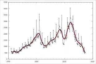 Number of permanent settlers arriving in Australia from New Zealand since 1991 (monthly).