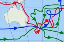 The routes of Captain James Cook's voyages. The first voyage is shown in red, second voyage in green, and third voyage in blue.