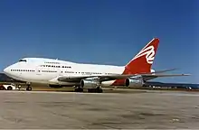 The airline operated two Boeing 747SPs[3] and a Boeing 767[4] seconded from the Qantas fleet, repainted in a modified livery, which did not display the Flag of Australia, or the kangaroo logo, which was replaced by a dynamic ribbon. It initially flew its flights using the IATA code IM but switched to Qantas's QF in 1994.