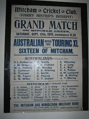 As advertised in the poster, Mitcham hoped to include Jack Hobbs, Andy Sandham and Herbert Strudwick but none of these took part on the day. Mitcham's sixteen was bolstered by the inclusion of three guest players, one of them Bill Stirling. The other two were Surrey wicketkeeper Dennis Sullivan, who was born in Mitcham, and amateur Burnett Bullock, who was "mine host" at the public house opposite the ground that now bears his name. Mitcham batted first and scored 200 all out, their captain Howard Lacey making the top score with 39. Trenerry and Collins shared twelve of the fifteen wickets while Gregory was bowled sparingly. The AIF included a couple of players from their second eleven but they won easily by five wickets, though Stirling took the wickets of Murray and Docker cheaply.[61]