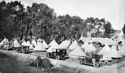 The Australian Voluntary Hospital assembled its personnel and equipment at a camp established on the grounds of the Ranelagh Club, which had been loaned for the purpose. It departed for France on 29 August 1914 on Lord Dunraven's yacht "Greta", which had been accepted by the Admiralty as a transport for medical units,[2] and moved to Le Havre. Owing to the German advance, the hospital was evacuated to St Nazaire on 2 September, and reopened there 5 September. The 100-bed hospital was set up in a park under canvas, with a school and house close by rented for various facilities. It began receiving casualties from the retreat from Mons the next day.[1]