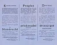 The occupational authorities were gripped by the fear of levée en masse and of civilians taking up arms. The Austro-Hungarian Army consequently employed the seizure of hostages from the general population and the burning of villages in punitive raids as a means of quelling resistance. These measures, as well as summary executions, were all permitted under section 61 of the Dienstreglement[lower-alpha 5] (k.u.k army regulations).[88] Disarming the populace was done by holding village elders responsible for handing over a certain quota of weapons that were judged to be held before the war began.[90] The sentence for possession of a weapon was death by hanging. Military courts also tried civilians for newly defined offenses, including the crime of lèse-majesté.[91]