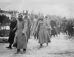 In early February 1917, a rebellion led by Vojinović broke out in the vicinity of Kuršumlija and Prokuplje. The insurgents, supported by volunteers and Chetniks from Montenegro, liberated Kuršumlija, Prokuplje, Pusta Reka, Lebane and Ribarska. The uprising was planned to coincide with an Allied offensive.[117] Later that month, a large scale uprising broke out in the Toplica District in Bulgarian-occupied Serbia. A force of 4,000 armed men and women managed to liberate a significant area in the Morava Valley before the uprising was put down.[46] During the summer of 1917, the Austro-Hungarian Army was forced to bring in troops from the Isonzo Front to reinforce the Bulgarian Army and Bulgarian paramilitary groups.[118] Without the expected Allied support, the uprising collapsed. In late 1917, Vojinović was killed; Pećanac managed to escape and went into hiding. According to contemporary Austro-Hungarian Army reports, 20,000 Serbs were killed in the course of the rebellion, while 2,600 managed to escape into the forests.[119] Despite the harsh repression, guerrilla groups managed to survive and were able to support Allied offensive operations in the summer of 1918.[120] After the war, Chief of Staff Paul Kirch described the withdrawal of the German 11th Army: