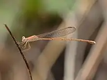 The genus name Austrolestes is derived from the latin word auster meaning south wind, hence south; and the damselfly genus Lestes, which is from the Greek word λῃστής meaning a robber.[1][4] In 1913, Robin Tillyard described the genus Austrolestes as having characters similar to the very large genus Lestes, which, unlike Austrolestes, sit with their wings outspread.[1]