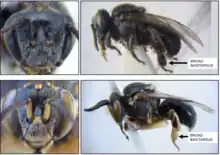 Worker (top) and drone (bottom) of A. magna. The black arrows point at the characteristic broad basitarsus of the species.