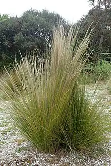 Austrostipa stipoides, commonly known as prickly spear-grass or coast spear-grass, is a kind of tussock grass native to the coasts of south-eastern Australia and of New Zealand. It forms large clumps up to about 80 cm in height with smooth inrolled leaves 70 cm long and 1 mm wide with sharp tips. It is found on sea cliffs, the edges of beach dunes and salt marshes and tolerates strong winds and sea spray.[1][2]