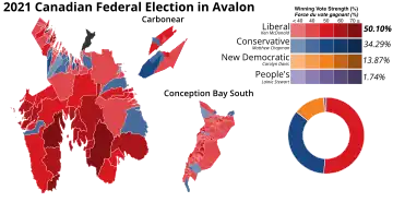 The 2012 federal electoral boundaries redistribution concluded that the electoral boundaries of Avalon should be adjusted, and a modified electoral district of the same name will be contested in future elections.[6] The redefined Avalon had its boundaries legally defined in the 2013 representation order which came into effect upon the call of the 42nd Canadian federal election, scheduled for October 2015.[7] 21% of this riding will be moved into Bonavista—Burin—Trinity, and 3% will be moved into St. John's South—Mount Pearl, and will gain 25% of its new territory from St. John's East. It was given the boundaries described above.