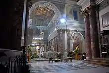 On the walls, below the cornice, are two paintings by Achille Iovine showing the Holy Family, to the left, and Saint Lawrence the Martyr to the right; there are in addition four niches containing gesso statues of the Four Evangelists. Above the cornice are five paintings by Angelo Michele Ricciardi of saints: Saint Francis Xavier, Saint Charles Borromeo, Saint Andrea Avellino, Saint Modestinus and Saint Gaetano Thiene.