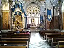 The cathedral interior has a Latin cross floorplan. The nave is divided into three aisles by pilasters; the transept leads into a large presbytery.