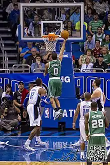 On October 30, 2012, the Celtics exercised their fourth-year team option on Bradley's rookie scale contract, extending the contract through the 2013–14 season.[18] With Bradley still sidelined for the beginning of the 2012–13 NBA season, the aging Celtics struggled with the duo of Courtney Lee and Jason Terry receiving the majority of minutes at shooting guard. On January 2, 2013, Bradley returned to action against the Memphis Grizzlies, regaining his spot as the starting shooting guard and providing a significant boost to the team, evident by their winning six out of Bradley's first seven games back. However, the season was ultimately a disappointment for both Bradley and the Celtics. Although he led the league in fewest points per play allowed on defense, at 0.697,[19] he struggled offensively, shooting just 40.2 percent from the field and managing 15 or more points just five times in 50 regular-season games. The Celtics lost any realistic chance of contention when point guard Rajon Rondo went down with a torn ACL on January 27,[20] leaving them without their most dynamic player. After falling behind three games to none against the New York Knicks in the first round of the playoffs, Boston mounted a furious comeback, winning two games and narrowly losing Game 6. Bradley, whose play in the series had mirrored the ineffectiveness of the team, provided a gutsy effort at the end of the game, making all four of his shots and stealing the ball three times in the last ten minutes.[19] The Celtics entered the offseason with an eye toward the future and Bradley a vital part of their plans to rebuild a contender.