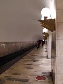 The station is built in a three-vault configuration 53 metres (173 feet) underground. The central hallway contains a sculpture made out of anodised gold pyramids and tetrahedra. The architects of the station are A.F. Strelkov, V.I. Klokov, N.I. Demchinsky, J.A. Kolesnikov, and E.S. Barsky. The theme of Aviamotornaya is aviation and flying. The columns holding up the ceiling are glazed in a light marble tone. The floor is made up of granite plates coloured in different shades of grey. The wall at the end of the central hallway is faced in a metal sculpture depicting Icarus. There are decorations mentioning and detailing the main constellations.[1]