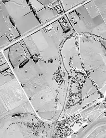 Awapuni in 1949. The railway station is west of the stream at the top. The racecourse is in the bottom right of the photo