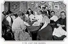 Demonstrating a "domestic ideal and moral framework", the parlour of the Home was depicted in Alec Robert's Living London article "Missionary London", with a group of women looking busy sewing and reading.[15] Expressing Christian charity for the benefit of the ayahs' welfare and the British empire, the Home encouraged the ayahs to show gratitude and loyalty.[4]