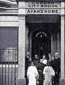The exact date and method of establishment of the Ayahs' Home is unclear.[8] Evidence from the India Office gives a foundation date of 1825;[9] however, it has also been said to have been founded in 1891 by a Mr and Mrs Rogers at 6 Jewry Street, Aldgate.[4] It appears to have been closed prior to 1891 due to administrative inadequacies,[9] but, in response to the lobbying of a committee of white British women, the foreigners' branch committee of the London City Mission (LCM) took it over and prevented its permanent closure.[4] Around 1900, the Home moved to 26 King Edward Road, Hackney, and in 1921, requiring more space, it moved to the larger 4 King Edward Road.[4] The new home was opened by Lady Chelmsford, wife of Frederic Thesiger, 1st Viscount Chelmsford, the former Viceroy of India[8][9] and ran until 1943 when the address is recorded as the East London Tabernacle Hostel.[10]