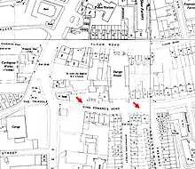 Former locations of the Ayahs' Home (arrowed) at King Edward's Road, Hackney, on a 1948 map[3]
