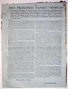 "Ayamo moyolpachihuitia in Totlatocatzin Rey D. Fernando VII..." (English: "Our ruler King Don Fernando VII is not yet satisfied") are the first words of a Nahuatl-language broadside printed on October 5, 1810, by Francisco Javier Venegas de Saavedra, viceroy of New Spain, as propaganda during the Hidalgo revolt. It announced the abolition of tribute payment by the Indians of New Spain, which, it was hoped, would reduce Indian support for the rebellion.