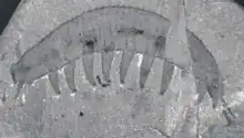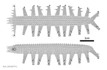 Aysheaia has ten body segments, each of which has a pair of spiked, annulate legs. The animal is segmented, and looks somewhat like a bloated caterpillar with a few spines added on — including six finger-like projections around the mouth and two grasping limbs on the "head". Each leg has a subterminal row of about six curved claws.[1] No jaw apparatus is evident.[2] A pair of legs marks the posterior end of the body, unlike in onychophorans where the anus projects posteriad; this may be an adaptation to the terrestrial habit.[2][3]