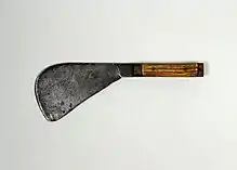 The ayudha katti is the traditional sword of the Kodavas [1] The Kodavas inhabit the region of Kodagu in southwestern India in what is now the state of Karnataka. The Kodavas have resided in the area for over 2 millennia cultivating paddy fields, maintaining cattle herds and carrying arms during war.[2] The invention of the ayudha katti probably started around the 17th-century. It was first invented as an implement used to cut through dense undergrowth.[3] The shape of the blade is similar with the Turkish yatagan and northern Indian sosun pattah, which indicates that it is related to the Ancient Greek kopis blade.[3]