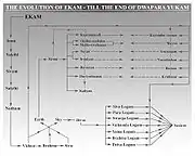 The mythical narrative speaks of Sivam (matter) and Shakti (energy) as the next evolved powers from the supreme Ekam. Then the Three lesser God-heads (i.e., Trimurthi) which are Sivan, Vethan and Thirumal evolved from this Shakthi. It also speaks of several further evolved lesser Gods. But in Kali Yukam, due to the cruel nature of the boons offered to Kaliyan, Thirumal (the then supreme power) cannot destroy the sixth fragment of Kroni directly so all God-heads were unified into the Ekam, and Ekam Incarnated in the world as a Turine god (Ekam, Narayana and Human) in the form of Vaikundar to overcome the boons and to destroy Kali. Since all were unified in Vaikundar, in Kali Yukam Vaikundar he was the Supreme Power and he was the only worshipable God. So in this regard Ayyavazhi is also viewed as a monotheistic religion.[1]