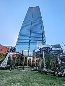 Azabudai Hills consists of three buildings: Azabudai Hills Mori JP Tower, Azabudai Hills Residence A and Azabudai Hills Residence B.[3] Mori JP Tower, measuring 325.2 metres (1,067 ft) and featuring 64 floors, was the first supertall to be built in Tokyo. Its appearance was designed to complement the nearby Ark Hills Sengokuyama Mori Tower, a project by the same architect and developer located 250 metres (820 ft) away. The two accompanying buildings, Residence A and Residence B, measure 237.2 and 262.8 metres (778 and 862 ft) in height and feature 54 and 64 floors.[4] The three skyscrapers were designed by Pelli Clarke Pelli Architects, the firm of Argentine architect César Pelli. Upon completion in 2023, the Azabudai Hills Mori JP Tower became the tallest building in Tokyo, surpassing the nearby Toranomon Hills Station Tower, as well as in Japan, surpassing Osaka's Abeno Harukas.[1][5]