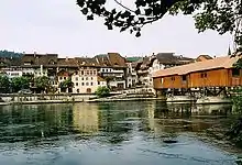 ![]() Büren with the historic wooden bridge spanning the Aare | |