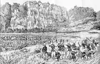 At 4 p.m. Dugenne resumed his advance. Aware of the potential for a misunderstanding, he gave strict instructions that nobody was to open fire except on his order. For several minutes the French column marched unmolested along a jungle path towards a group of Chinese forts on the cliffs of Nui Đồng Nai. Seeing the path opening into a clearing, Dugenne ordered Laperrine's cavalry to replace an inexperienced section of Tonkinese riflemen at the front of the column. As the French cavalry spurred their horses forward to move to the front of the column, Chinese infantry in the Nui Đồng Nai forts suddenly opened fire on them. Seconds later, Chinese infantry shadowing the march of the French column opened fire on both its flanks. It is not clear whether the Chinese were alarmed by the sudden movement of the French cavalry or (as the French believed) they mistook the horsemen for a party of senior officers and deliberately fired on this tempting target.[14]