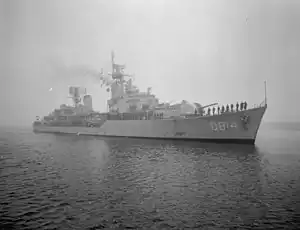 HNLMS Limburg (D814) (Dutch: Hr.Ms. Limburg) was a destroyer of the Friesland class. The ship was in service with the Royal Netherlands Navy from 1956 to 1980. The destroyer was named after the Dutch province of Limburg and was the first ship with this name. In 1980 the ship was taken out of service and sold to Peru where it was renamed Capitan Quiñones. The ship's radio call sign was "PATM".[1]
