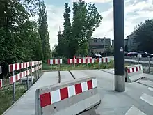 Traffic has been stopped since the fall of 2017, following the impact of construction of a 15-storey facility on the river bank by Nordic Astrum.[8] During the first building works, the street ground was displaced, resulting in a small landslide that fissured the house at 8 Babia Wieś Street, damaging the road surface, unsealing a gas pipeline and weakening the foundations of the tram track. The repair of the 130 metres (430 ft) of missing tracks, necessary for a re-opening, is not foreseen before the end of 2023.[9]