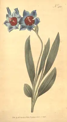 Babiana rubrocyanea is a perennial geophyte of 5–15 cm (2.0–5.9 in) high, with entire, lance-shaped, hairy, pleated leaves and flowers that have a narrowly funnel-shaped tube at their base and six free tepal lobes at the top that form a wide cup that is purplish blue with a sharply defined carmine red centre. It can be found in a small area of the Western Cape province of South Africa. Flowers can be found from August to the middle of September. It is called blue-and-red babiana in English and rooibloubobbejaantjie in Afrikaans.[2]
