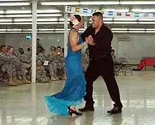 Bachata is a social couple dance with a lead and follow that can be performed in open, semi-closed or closed position. The basic step involves an eight-count side-to-side movement, with many variations and styles that can be added. On counts 4 and 8, bachata includes an exaggerated hip check that gives it a characteristic look and differentiates it from bolero or son dancing.[1] Counts 1 to 3 are moving to the lead's left, starting with the left foot, and counts 5 to 7 are moving to the lead's right, starting with the right foot. The hip check can be performed as a tap or slight lift of the foot for beginners.[2]