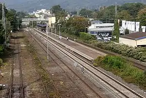 In 1999, Deutsche Bahn closed its ticket office, which was initially taken over and operated by an agency, but was later closed.[8] Around 2000, 1500 passengers frequented the station daily.[9] For a number of years, the station building, which is no longer used for railway purposes, has served as the headquarters of a passenger transport company. In 2011, Deutsche Bahn sold it to the company. The new owner plans to demolish it and build a new railway station building in the long term.[10] The station forecourt was extended in 2011/12 in two construction phases with the removal of the cobblestone pavers and the construction of a barrier-free bus stop.[11][12] Recently, efforts have been made to upgrade the station and open a kiosk with ticket sales for regional transport and a postal agency.[13] In the long term, the city plans to abandon the existing station location in favour of a new station at the end of the Stadtbahn (Siebengebirgsbahn) (as of 2016).[14]